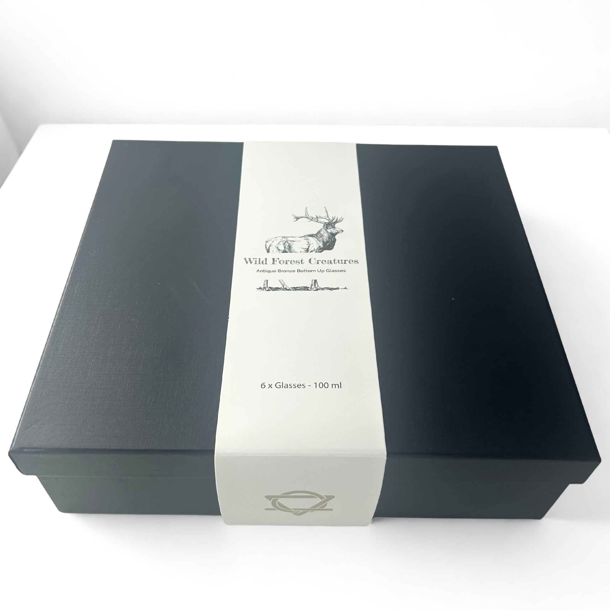 Los vasos presentan un acabado en bronce antiguo, aportando un toque sofisticado y rústico a la vez, manteniendo la esencia artesanal que distingue a cada diseño. Se entregan en elegantes cajas negras, protegidas cuidadosamente con material acolchado, lo que los convierte en una opción ideal para coleccionistas, bares, restaurantes o como regalo exclusivo y distintivo.