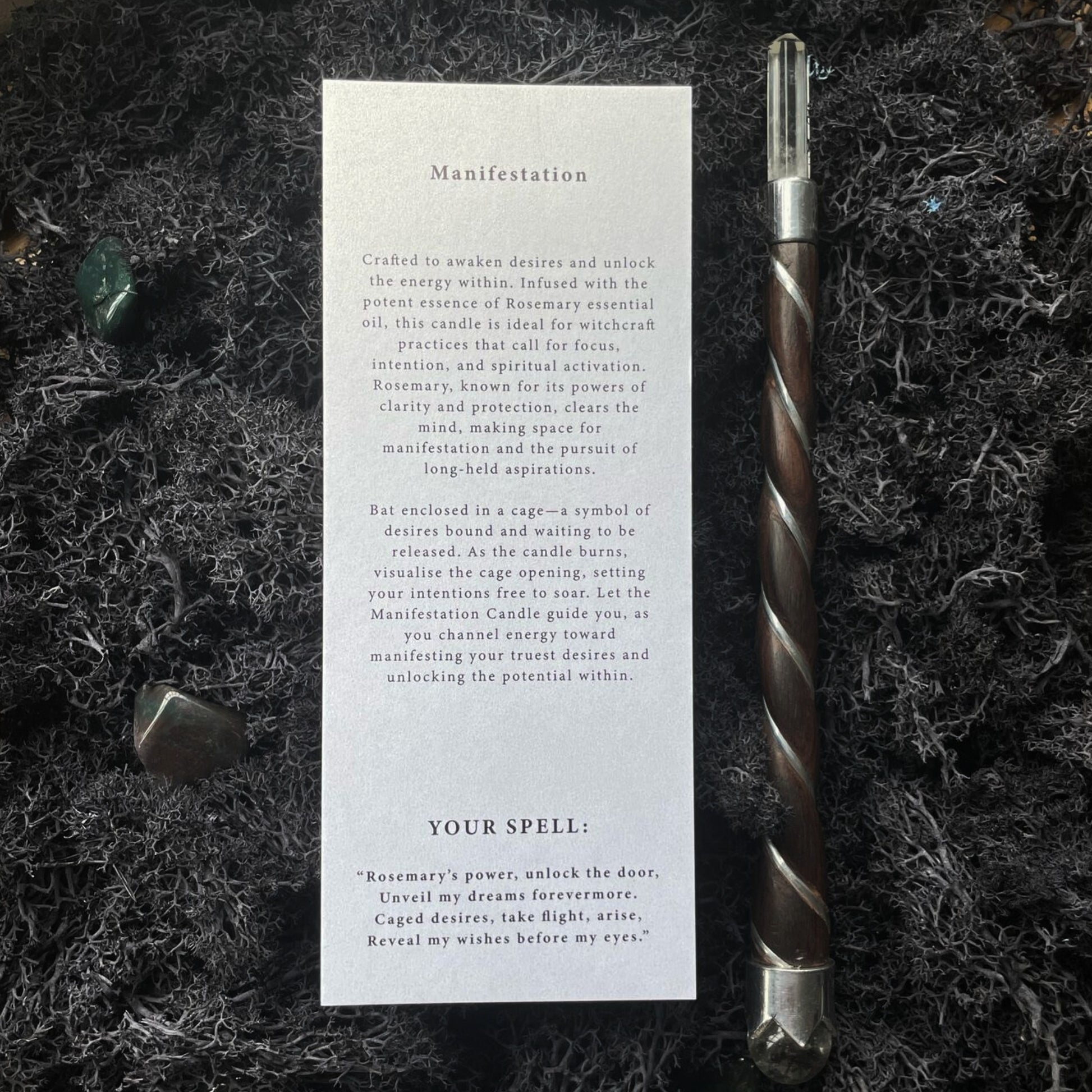 Cada vela viene en una caja de cartón elegante con simbología inspirada en la liberación energética y el poder del romero. En su interior encontrarás una tarjeta ritual con un hechizo exclusivo de manifestación, diseñado para ayudarte a dirigir tu intención y desbloquear tus deseos.